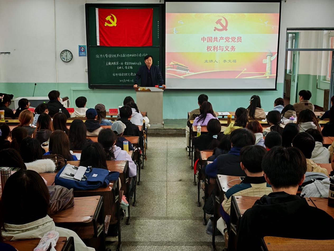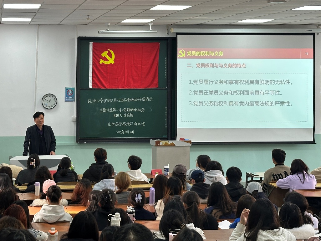 天津科技大学经济与管理学院党校举行第十五期 入党积极分子培训班开班式暨专题讲座第一讲 为深入贯彻习近平新时代中国特色社会主义思想,进一步引导入党积极分子端正入党动机,坚定理想信念,2025年10月22日,天津科技大学经济与管理学院党校第十五期入党积极分子培训班在河西校区第七阶梯教室开班。在开班仪式上,主持人向本期122名学员介绍了培训班的各环节教学内容和相关注意事项,强调了培训纪律要求。 在随后进行的专题讲座第一讲中,经济与管理学院党委书记李文福以《党员的权利与义务》为主题,向入党积极分子讲解了党员权利与义务的核心内涵。