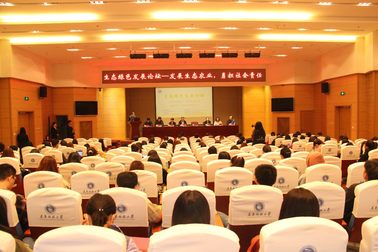 10月24日,我校滨海校区逸夫楼报告厅隆重举行主题为“发展生态农业,勇担社会责任”的生态绿色发展论坛。 本次论坛在天津市科学技术协会的支持下,由我校科学技术协会主办,天津科技大学--天津食品集团联合研究院、我校食品安全科普基地、经济与管理学院、金融工程与风险管理研究中心联合承办。出席会议的有校内外学者、企业管理专家,大家齐聚一堂,共商校校合作,校企合作,生态绿色发展良策。