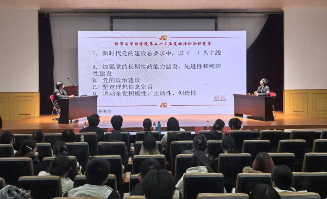 经济与管理学院党校举办第二十三届党的理论知识竞赛 为深入学习贯彻党的创新理论,夯实青年学子的思想根基,经济与管理学院党校第十五期入党积极分子培训班于2025年11月12日在河西校区图书馆报告厅面向全体学员举行第二十三届党的理论知识竞赛。本次竞赛由经济与管理学院党建工作办公室承办,通过多元化竞赛形式让广大学员从实践教育中学习党的理论知识,展现新时代青年学子坚定的理想信念与昂扬的精神风貌。