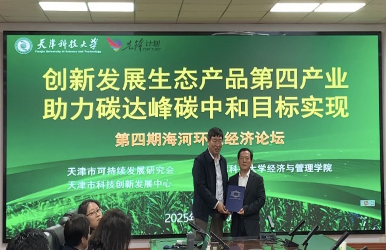 2025年10月10日,第四期“海河环境经济论坛”在天津科技大学经济与管理学院成功举行。天津市可持续发展研究会杨超英书记,辽宁大学经济学院院长李政教授,博通资本董事长李小平,天津市科技创新发展中心科技金融部副部长刘东岳,天津科技大学海河科创学院(新质生产力研究中心)院长华欣教授,天津科技大学艺术与设计学院院长张志宇教授,天津科技大学经济与管理学院院长宋有涛教授,副院长朱建民、于丽艳以及十余位经济与管理学院师生参加了论坛,共话绿色发展与“双碳”目标下的路径探索。